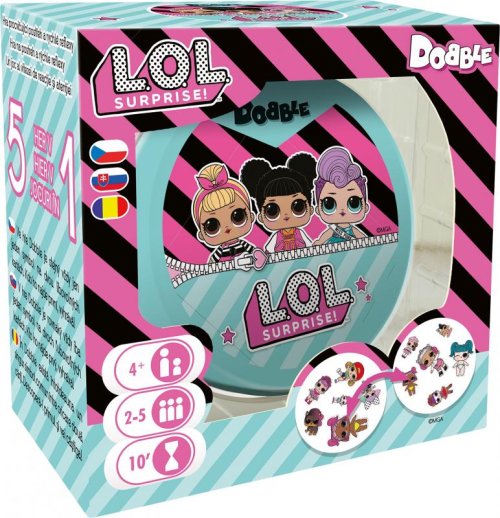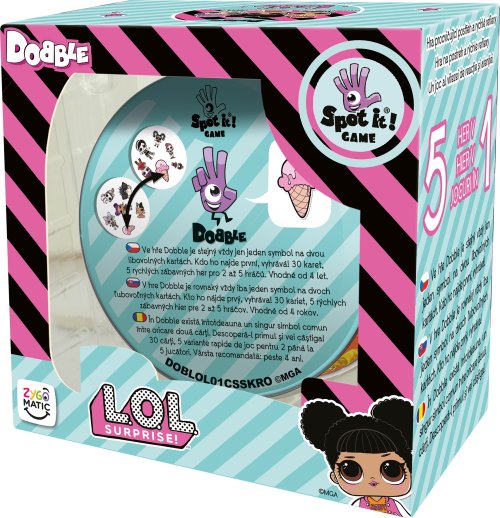 Rychlost, postřeh, reflexy! Dobble L.O.L., to je 31 různých obrázků, 30 karet, 6 obrázků na kartě a každé dvě karty spolu mají společný jen jeden obrázek!Hra je kompletně v češtině i slovenštině a nabízí zcela unikátní zábavu. Děti zde hledají dva stejné obrázky na kartách při různých verzích hry (v pravidlech je popsáno celkem 5 her). Super jsou kulaté karty i jednoduchá pravidla vysvětlená doslova za pár sekund. Hra je určená především pro děti, ale i jejich rodiče - zkrátka pro všechny, kteří se chtějí pořádně bavit a nemají čas pročítat dlouhá pravidla. Plechová krabička zaručuje bezpečí karet a jednoduše umožňuje mít hru vždy u sebe. Vyzkoušejte i Vy postřehový fenomén Dobble a jistě budete překvapeni, jak i tak jednoduchá hra může být zábavná! • Obsah balení: 30 karet v plechové krabičce • 1 česká, slovenská a rumunská pravidla • Doporučený věk: 4+ • Doba hraní: 10 min • Počet hráčů: 2-5
