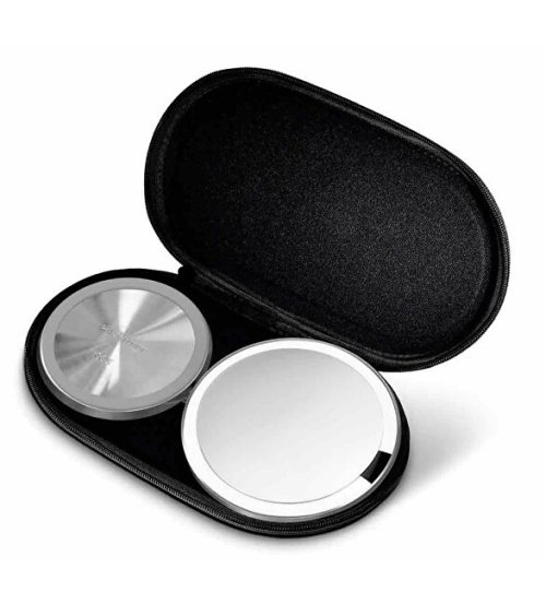 Cestovní senzorické kosmetické zrcátko Simplehuman s Tru-lux Led osvětlením zvětší vaši tvář 10x, čili vám usnadní úpravu obočí, líčení očí nebo precizní aplikaci rtěnky. Uvidíte každé zrnko pudru nebo nevytržený chloupek. Je dostatečně lehké, abyste ho mohli v případě potřeby snadno přenést na jiné místo. Zrcátko stačí dobít přibližně jednou za 5 týdnů (při každodenním používání). Dobíjí se přes klasický USB kabel. V balení naleznete také praktické černé pouzdro na zip. Je navržené tak, aby se do něj složené zrcátko vešlo na milimetr přesně. Díky tomu získáte neskutečně skladné cestovní balení, které se vám vejde i do kabelky.