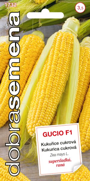 Gucio F1 - supersladká hybridní kukuřice se zlatožlutými zrny s vysokým obsahem jednoduchých cukrů. Klasy dorůstají výšky 22-28 cm a jsou osazené zrny až do špičky. Raná, spolehlivá odrůda dorůstající do výšky 170 cm.