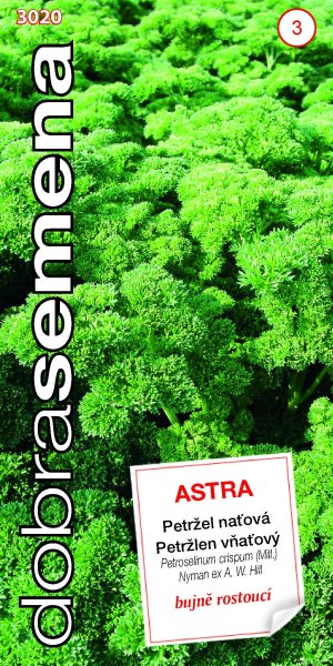 ASTRA - silně zkadeřená, výnosná listová petržel pro celoroční sklizeň natě. Bohatě dělené listy jsou tmavě zelené, hodí se pro přímý konzum, sušení i mražení. Nať po seříznutí intenzivně obrůstá a sklizeň lze po 8-10 týdnech několikrát opakovat. Vysévat můžete celoročně, v letních měsících je nutné zabezpečit dostatek vláhy pro vzejití. Vegetační doba z jarních a letních výsevů je 80-90 dní, z podzimních 150-180 dní.