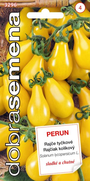 PERUN - oblíbená "žlutá hruštička". Žluté plody o hmotnosti 15 ¦ 20 g jsou sladké, příjemně měkčí konzistence. Bujně rostoucí tyčkové rajče nenáročné na pěstování. Dodržujte vyrovnaný vláhový režim, předejdete tak praskání plodů.