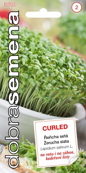 CURLED ¦ netradiční forma řeřichy s kadeřavými listy. Můžete ji využít k celoročnímu rychlení na vatě, vysetou "nahusto" na povrch. Je výborná i pro pěstování na záhonu, hlavně v jarním a podzimním období, kdy se sklízí větší rostliny s pravými listy. Obsahuje vysoké množství vitamínů A a C i aromatické látky dodávající jí typickou vůni a chuť.