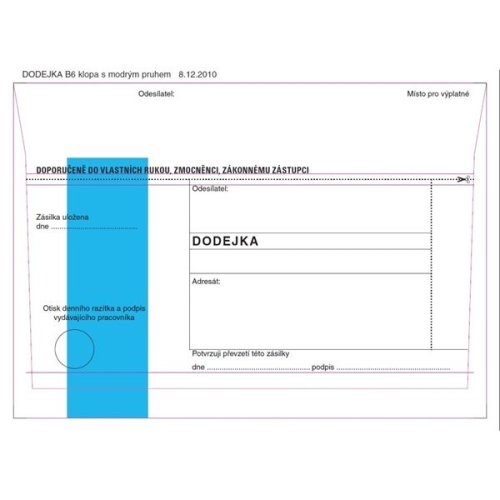 Dodejky ve formátu B6 s modrým pruhem (bez poučení) Samopropisovací provedení s perforací pro snazší odtržení klopy Lepení: samolepicí Rozměry: 17,6 x 12,5 cm Gramáž papíru: 80 g/m2 Barva: bílá, s modrým …