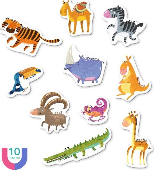 Každý magnet zobrazuje zvířátko a jeho název v angličtině. Učení angličtiny rychle a zajímavě.