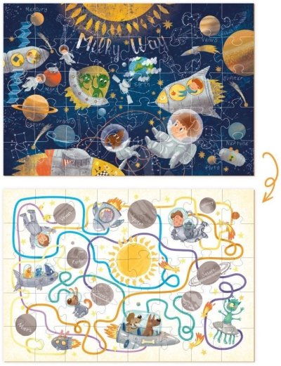 oboustranné puzzle se 40 dílky, 6 karet úkoly, plakát, 3 karty se samolepkami.