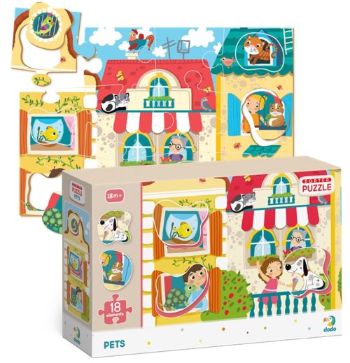 Skládání zpestřuje 6 speciálně tvarovaných dílků ve tvaru domácích mazlíčků. Rozměr složeného puzzle cca 45 x 31 cm