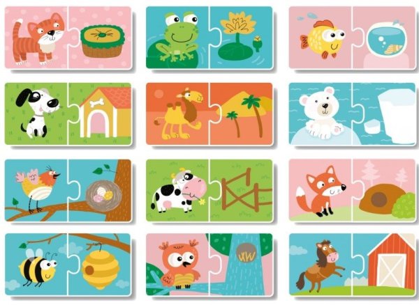Sada jednoduchých dvojdílných skládaček s je určena pro děti, které s puzzle začínají. Velké a pevné dílky s tloušťkou cca 3 mm usnadňují dětem skládání.