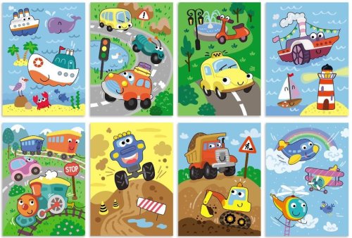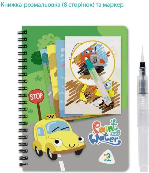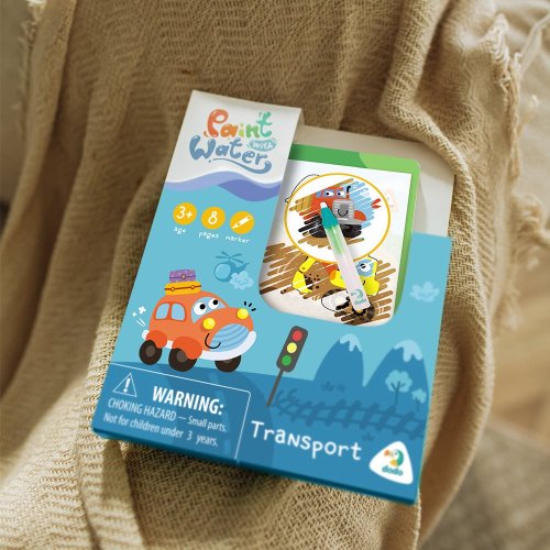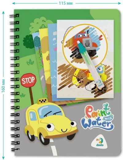 Kroužkový blok pro malování vodou s motivem dopravních prostředků.