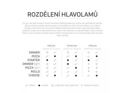 Hlavolamy jsou určeny pro všechny zvířecí hráče a jejich páníčky. Buďte proto po celou dobu hry se svým mazlíkem. Dbejte ale na to, aby hru hrál správně, motivujte ho a kontrolujte, aby hrací kameny nebo hru nekousal.