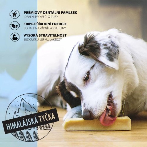 Himalájská tyčka je odolná žvýkací dobrota z kvalitního belgického mléka, sušeného po dobu 3 měsíců. Výsledkem je extra tvrdý dentální pamlsek, který si Váš chlupáč zamiluje! Obsahuje protein a vápník. Zároveň je bezlepková a obsahuje minimum laktózy a je certifikovaný k lidské spotřebě.