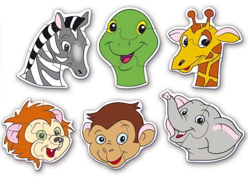Obrysové progresivní puzzle pro malé děti s šesti motivy hlaviček zvířat ze safari.