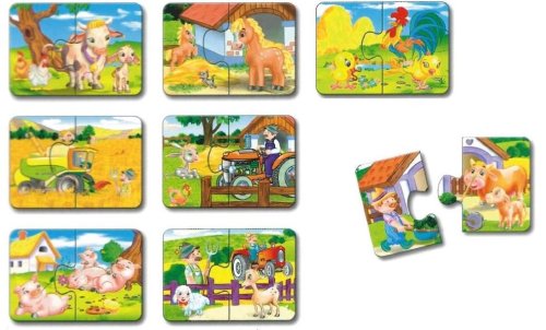 Dvoudílné puzzle s krásnými obrázky speciálně vytvořené pro nejmenší děti. Pevné dílky jsou vyrobeny z kartonu a podporují u dětí rozvoj motoriky, soustředění a fantazii. Mezi osmi obrázky najdete koníky, kravičky, ovečky, prasátka a další. Rozměr složeného puzzle cca 16,5 x 11,5 cm
