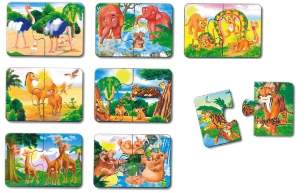Dvoudílné puzzle s krásnými obrázky speciálně vytvořené pro nejmenší děti. Pevné dílky jsou vyrobeny z kartonu a podporují u dětí rozvoj motoriky, soustředění a fantazii. Mezi osmi obrázky najdete slony, pštrosy, velbloudy, žirafy a další. Rozměr složeného puzzle cca 16,5 x 11,5 cm