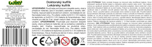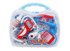 Doktorský kufřík. Velikost 30cm. Obsahuje fonendoskop, teploměr, stříkačku, pinzetu a další příslušenství pro hru na doktora. Baterie 4xAG10 součástí. Světelné efekty.