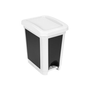 Lesklý nerezový odpadkový koš s nášlapným pedálem.