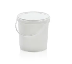 Plastový bílý kbelík s víkem s pojistkou a uchem pro přenášení.