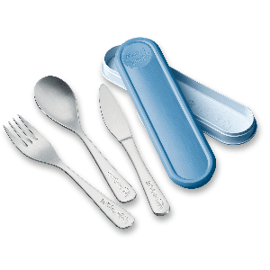 Příbor z nerezové oceli v plastovém pouzdře, obsahuje menší lžíci, nůž a vidličku - délka příboru je 15,5 cm.