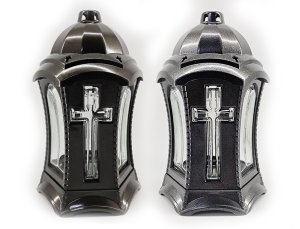 Hřbitovní lampa v podobě lucerny kombinuje materiály sklo a plast.
