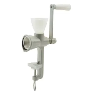 Litinový mlýnek, práškově lakovaný, s plastovou násypkou, pevný a skládací, upínání na stůl šroubem, jemné mletí máku.