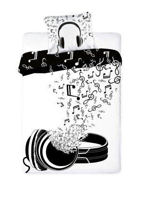 Černo-bílé mládežnické ložní prádlo pro milovníky dobré hudby je vyrobeno z kvalitní bavlny a zobrazuje sluchátka s notami vycházejícími ven.
