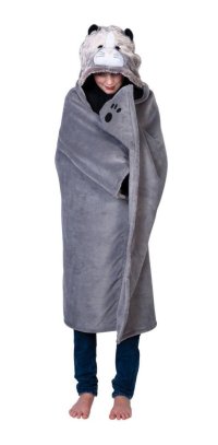 Zábavná, měkoučká, hřejivá deka s kapucí s motivem zvířátka a dvěma rohovými kapsami na ruce s motivem zvířecích tlapek.