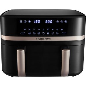 Horkovzdušná fritéza RUSSELL HOBBS Satisfry Dual basket 9 L 2 samostatné koše o kapacitě 4,5 l Černé texturované tělo s prvky v trendy champagne odstínu 2 samostatné varné zóny s digitálním dotykovým …