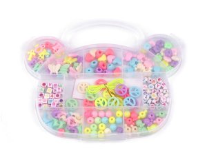 Plastový box s přihrádkami obsahuje mix plastových korálků různých barev i tvarů.