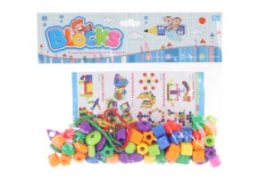 Navlékací korále. Obsahuje také barevné provázky na navlékání.