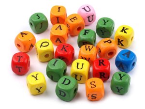 [Barevné kostky s potiskem písmenek stačí navléci na pruženku, kloboukovou gumičku nebo paměťový drát a veselý náramek se jménem je během chvilky na světě.