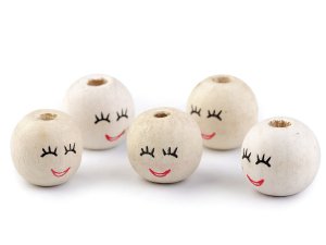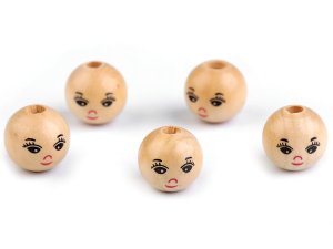 Malé dřevěné korálky s malovaným obličejem mají díky nalakování jemný lesk.