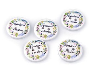 Dřevěné dekorační knoflíky zdobí květinový potisk a nápis "Vyrobeno s láskou".
