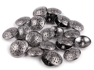 Kovové knoflíky s filigránovým vzorem jsou vyrobené ze slitiny zinku a nemagnetických kovů.