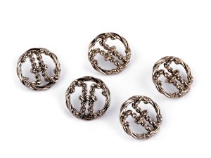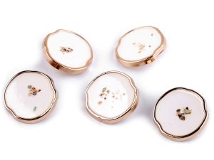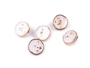 Luxusní kovové knoflíky zaujmou svým designem - mají nepravidelný kulatý tvar a naleznete v nich drobné kousky perleti zalité v pryskyřici.