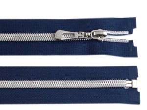 Dělitelný spirálový zip se stříbrnými zoubky je vhodný k našití na bundy, kabáty, mikiny nebo sportovní tašky.