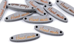 Dřevěnou cedulku oválného tvaru zdobí jednostranný nápis "hand made".