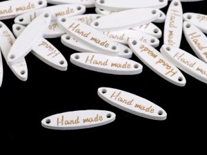 Dřevěnou cedulku obdélníkového tvaru se zaoblenými rohy zdobí jednostranný nápis "hand made".