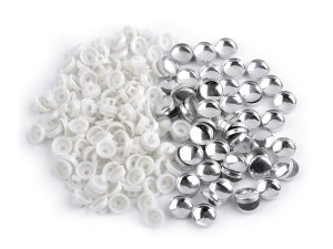 Drobný knoflík na potahování se skládá z kovové a plastové části.