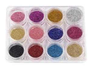 Sada 12 barev sypkých glitrů ve šroubovacích dózách se hodí na ozdobení prakticky čehokoliv. v oděvním průmyslu používají jako dekorace na textil.
