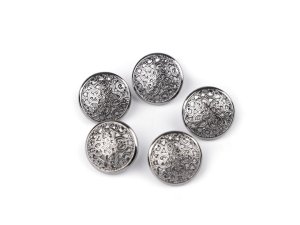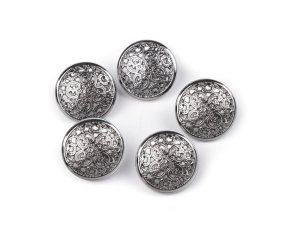 Kovové knoflíky s filigránovým vzorem jsou vyrobené ze slitiny zinku a nemagnetických kovů.