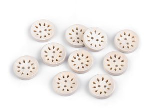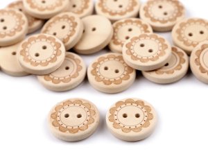 Dřevěné dekorační knoflíky zdobí laserem vyřezávaný motiv květu.