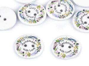 Dřevěné dekorační knoflíky s [nápisem "Handmade" vyniknou] na ručních výrobcích, dárcích a různých dekoracích.