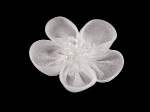 Romantický organzový květ s jemným třpytem je ve středu dozdobený propracovanými pestíky z broušených korálků.