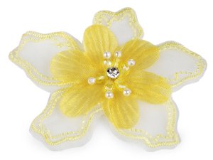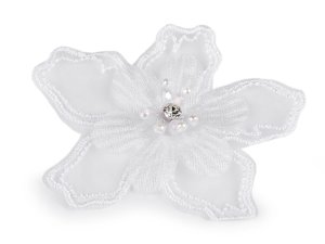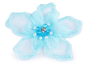 Romantický textilní květ z organzy s jemným třpytem je ve středu dozdobený propracovanými pestíky z broušených korálků.