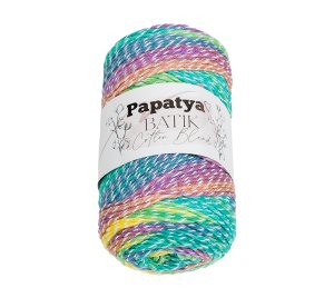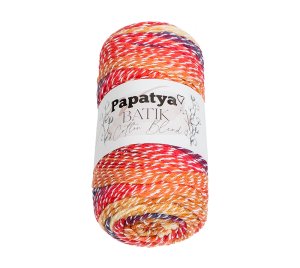 Příze PAPATYA COTTON BLEND batik materiál 70% Akryl, 30% Bavlna 100g / 225 m praní na 30°C jemný postup sušit v sušičce nedoporučujeme žehlit nedoporučujeme doporučená velikost jehlic č. 5 mm háček 3 …