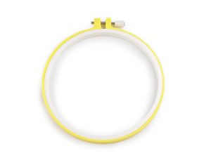 Plastový vyšívací rámeček je malý, je opatřený kovovým stahovacím šroubkem.