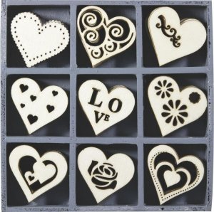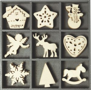Dřevěné ozdoby v praktickém boxu, 9 motivů po 5 ks.