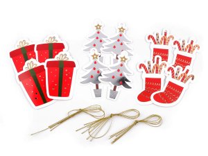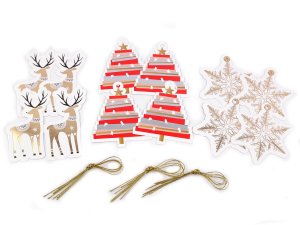 Papírové jmenovky s vánočními motivy se hodí na ozdobení zabalených dárků, dárkových tašek, lahví vína apod.