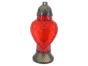 Skleněná hřbitovní lucerna s motivem srdce, výška 36 cm, včetně vkladu 180 g s výdrží hoření až 48 hodin.
