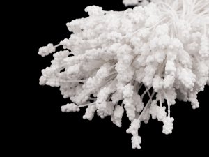 Pestíky, vhodné k výrobě květin, jsou matné a připevněné naškrobené na šňůrce.