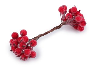 Dekorační bobule jsou zpestřeny drobnými transparentními kuličkami z plastu, které vytvářejí dojem námrazy.